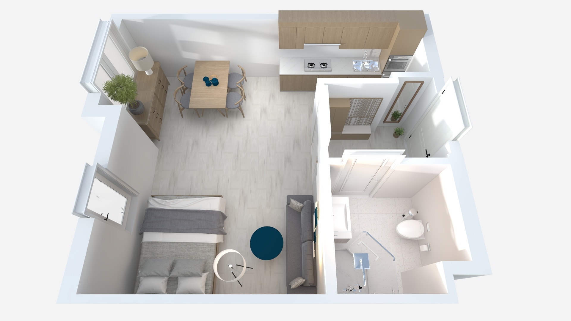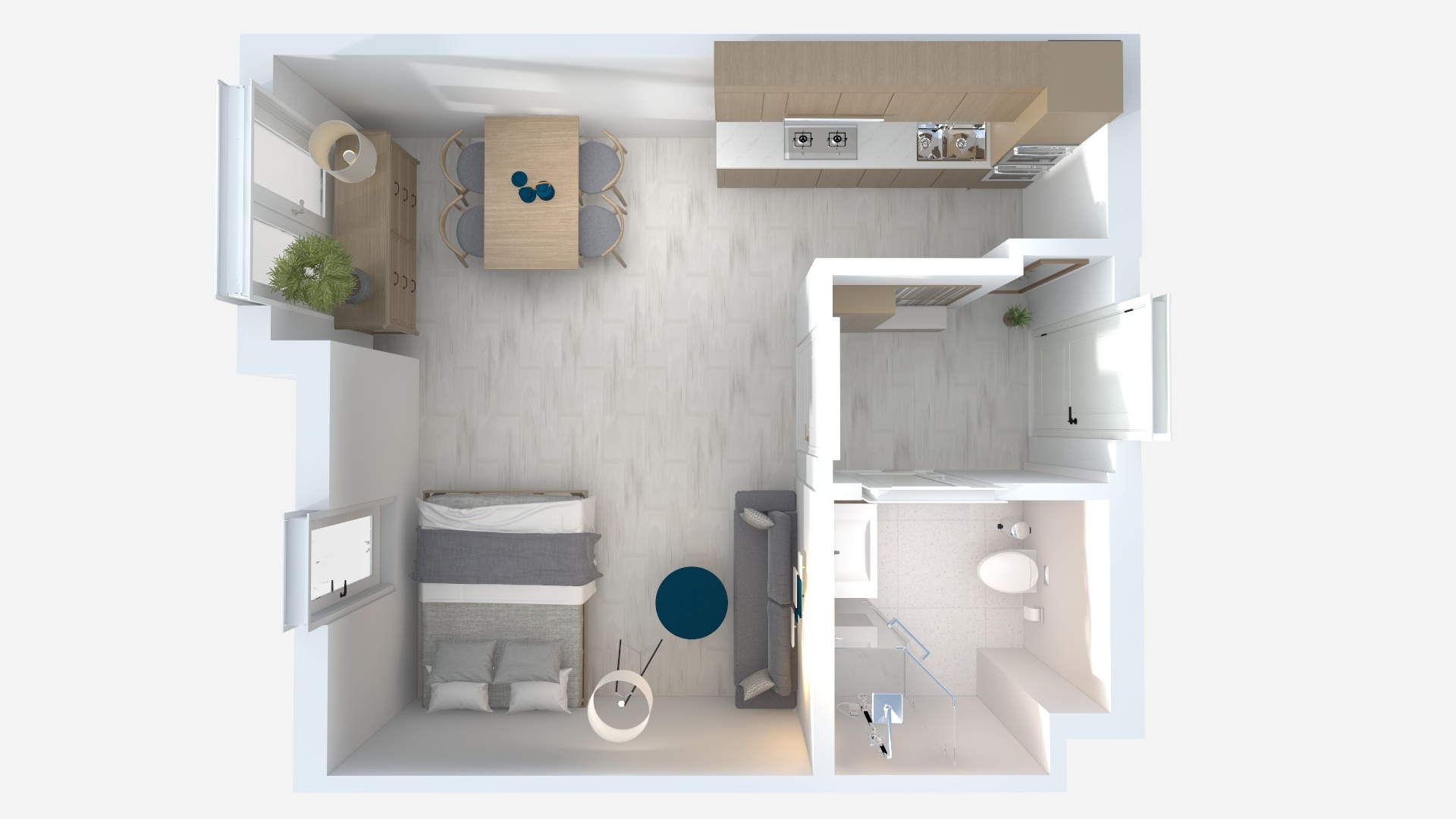 Dispozičně je tvořen předsíní (3,1 m²), prostorným obývacím pokojem s kuchyňským koutem (22,2 m²) a koupelnou se sprchovým koutem a WC (3,3 m²). Součástí je rovněž sklepní kóje v 1. PP o výměře 5 m², ideální pro uložení lyží, kol či další sportovní výbavy.