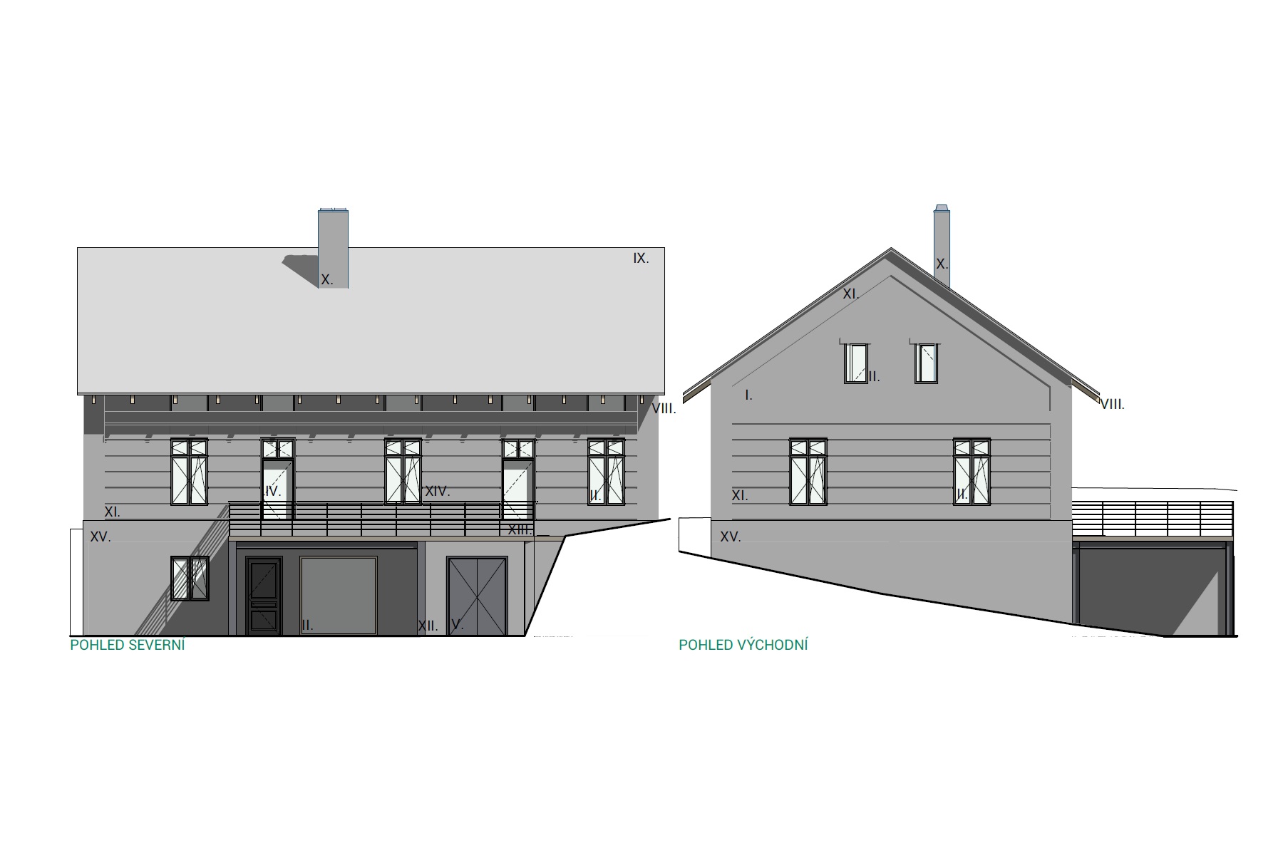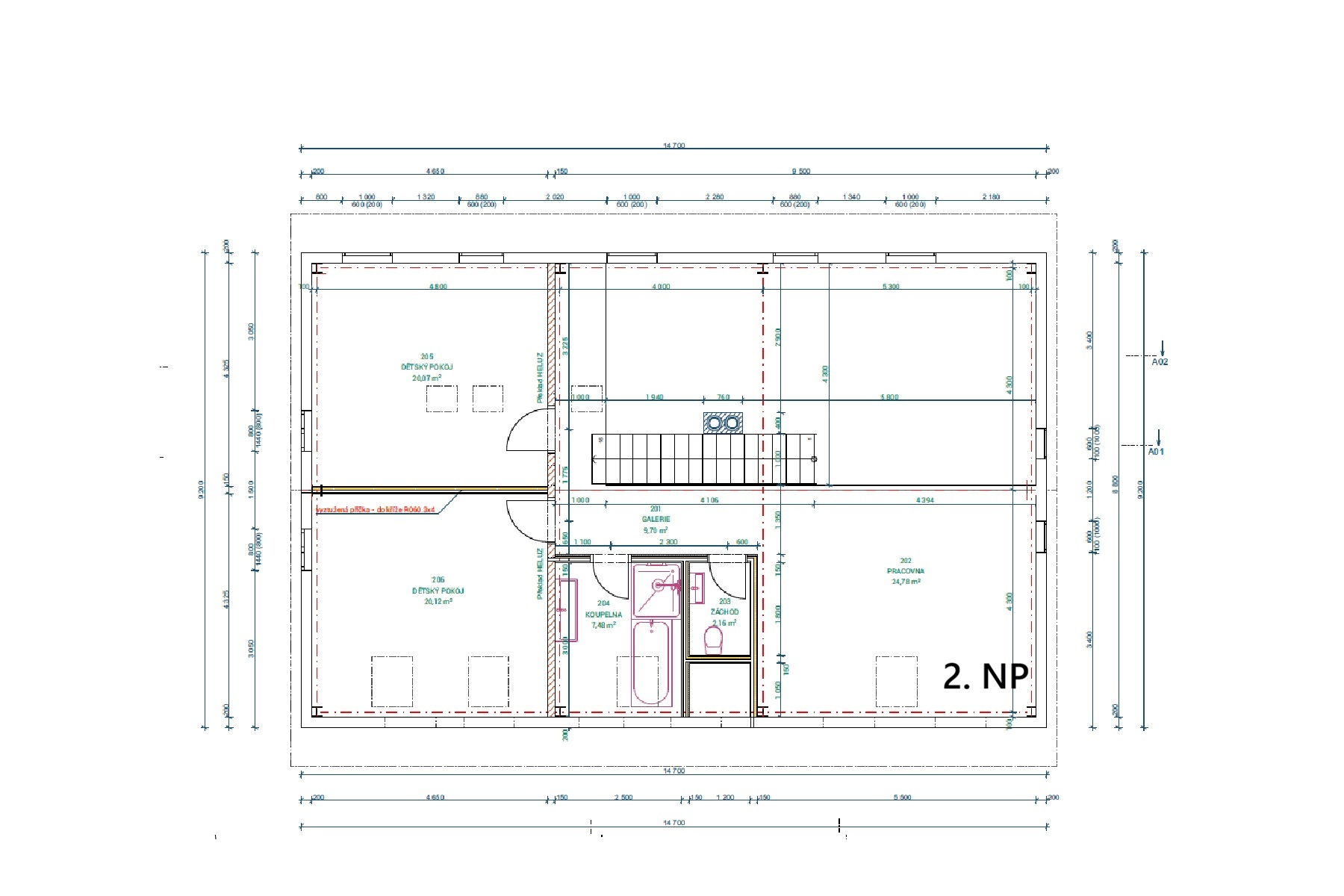 Hlavní obytné podlaží je koncipováno jako otevřený celek s obývacím pokojem, kuchyní a jídelnou, doplněný o ložnici, koupelnu, šatnu a hygienické zázemí. V horním podlaží se nachází další obytné místnosti, pracovna, galerie a koupelna. Celkově je dům navržen jako komfortní rodinné bydlení s důrazem na soukromí, výhledy a každodenní komfort bydlení.