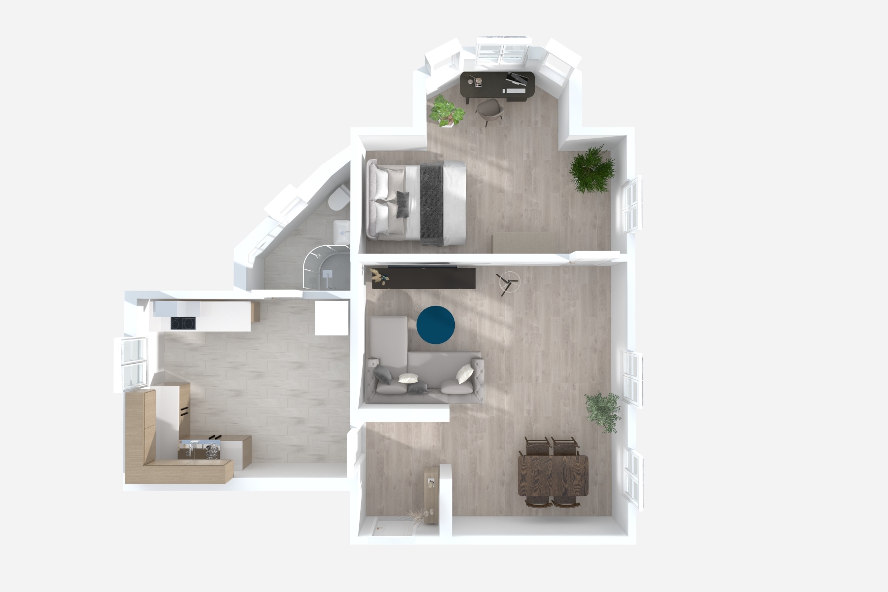 Byt dispozičně obsahuje dvě obytné místnosti, kuchyň a koupelnu spojenou s WC.